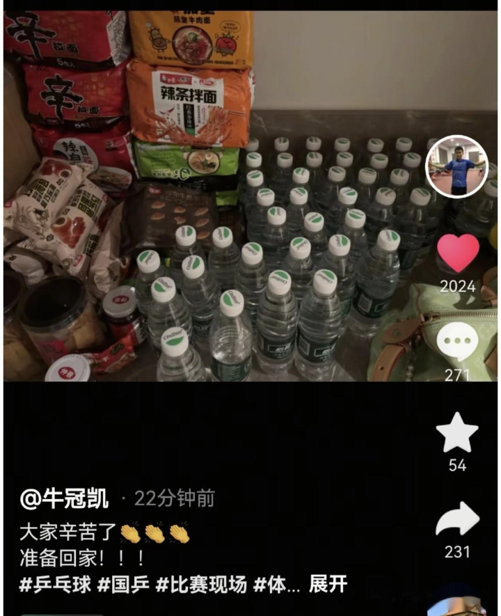牛冠凯晒出了国乒在印度的屯粮,泡面,矿泉水,面包,腐乳,榨菜,真的是不容易,这场比赛国乒也是吃了几天的泡面,水也是我们自己带的,真是辛苦我们的运动员了。不过没多久牛冠凯就删了这条动态。